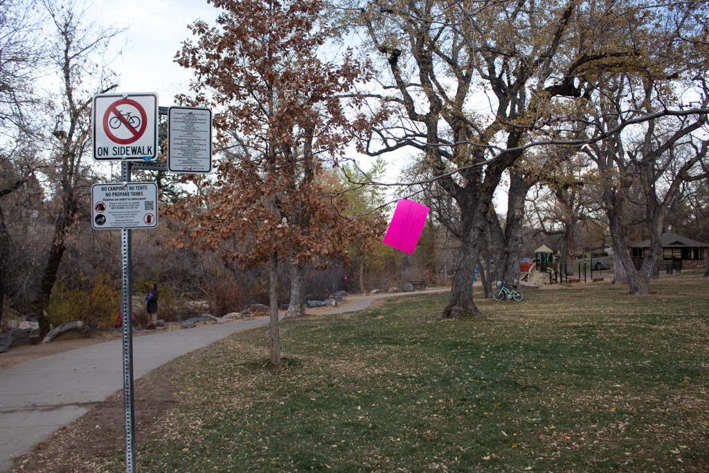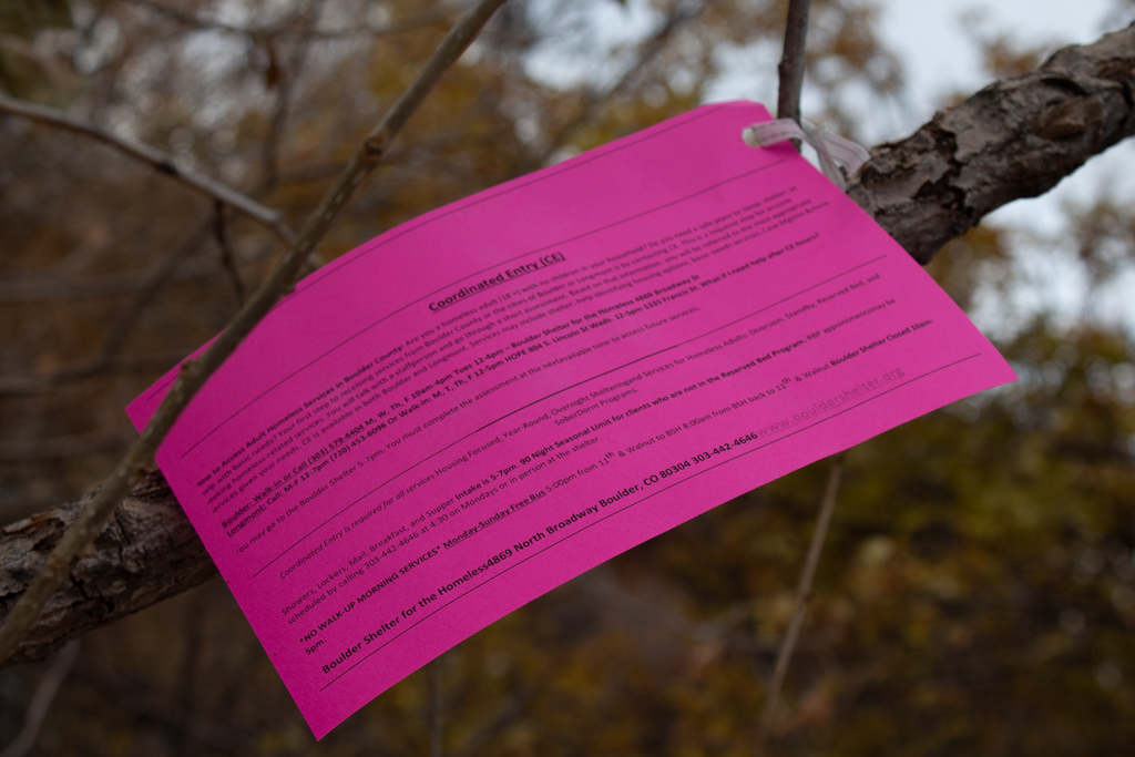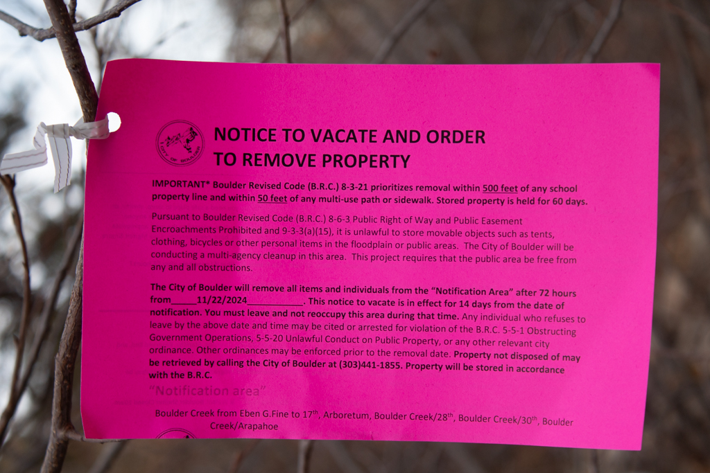 By placing images like the one found in Figure 2, a “notice to vacate” flyer targeted at a houseless community living along Boulder Creek, next to images like Figure 3 and 4, I call into question the territorial aggression granted by legislative bodies which allows for the continued dispossession of land occurring at sites along the stream.