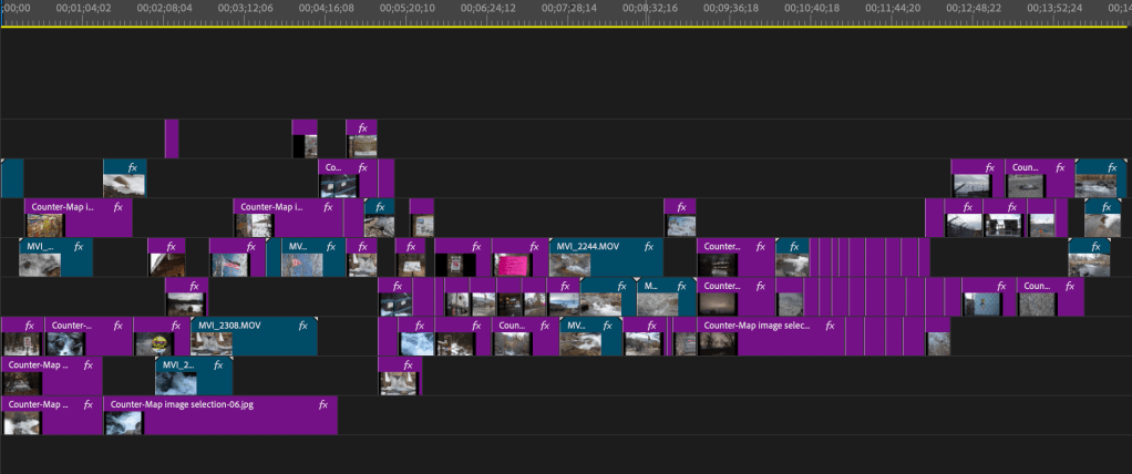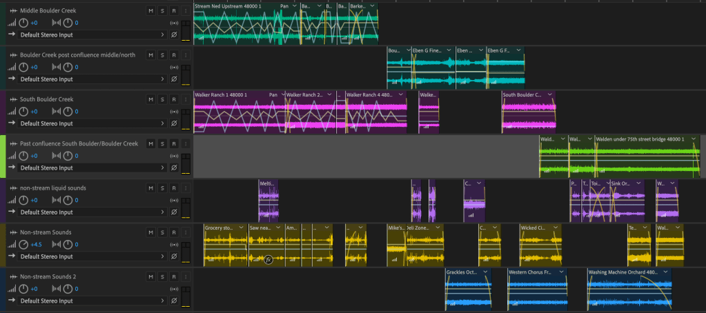 Through the inclusion of the sound score and the synchronous playing of sounds recorded at numerous locations along the creek, the map seeks not to represent a single location and a single point of time, but a spatio-temporal imaginary for the creek as images and sounds from different locations occur in order of the stream’s directional flow. By including the sound sequence from Adobe Auditions, I engage in a type of mapping where the sound waves and lines on the audio files create a visual representation of the sounds alongside Boulder creek. The panning and volume lines serve as the lines that I have drawn on my own sound map to establish relationality between the numerous inflowing streams before they eventually join together to form Boulder Creek. The images create a still representation of sound for the map-receiver to assign spatiality to. The link to the full video can be found in the Appendix.